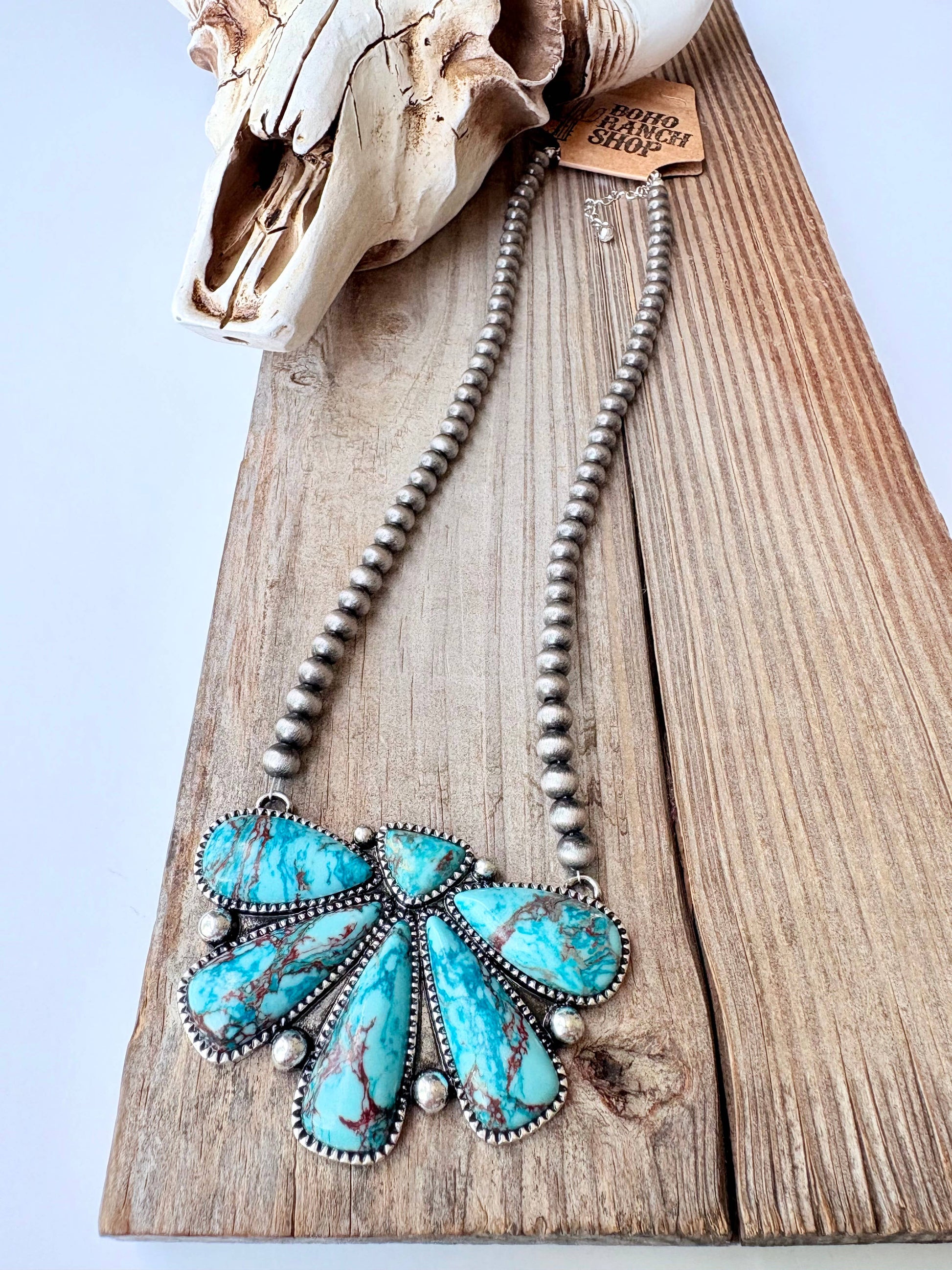 Western Squash Blossom Pendant w/ Turquoise Stone & Navajo Style Pearl Bead Necklace Size: 18" + 3" Pendant: 2.5"W x 1.75"L Lobster Claw Clasps Brushed Silver, Turquoise Stone, Navajo Pearl Bead